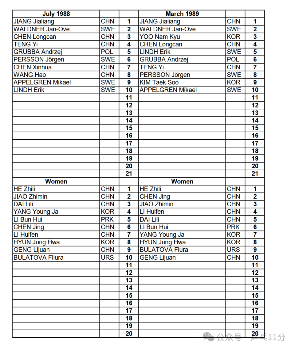 以88年为例,世界排名只有三月和七月。世界排名90年代开始变成一年四期,之前一年只有两期,很大程度上世乒赛冠军就是之后的世界第一。我粗略的翻到了60年代,确实没注意到有世乒赛前一期世界第一没有任何奖牌的情况。